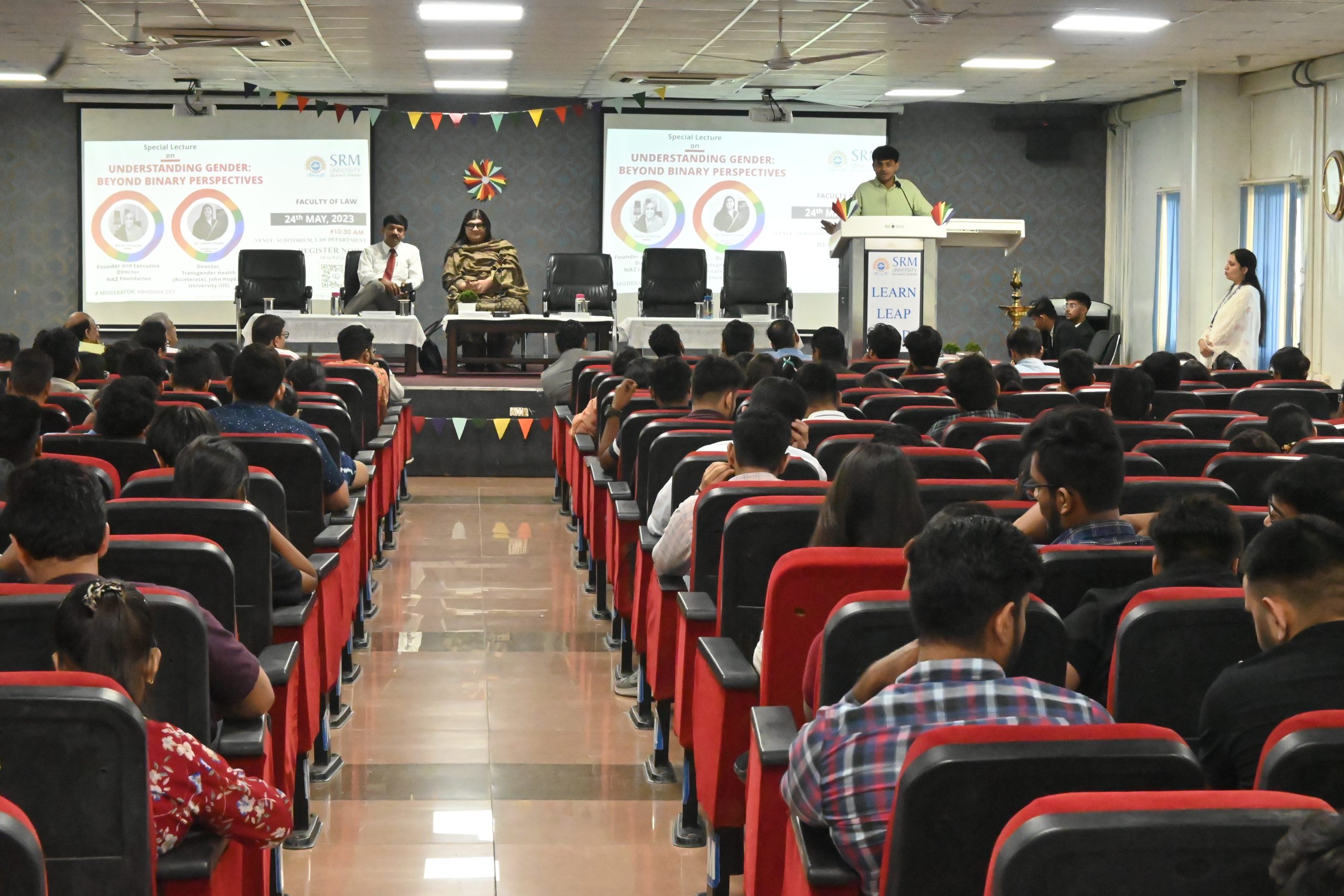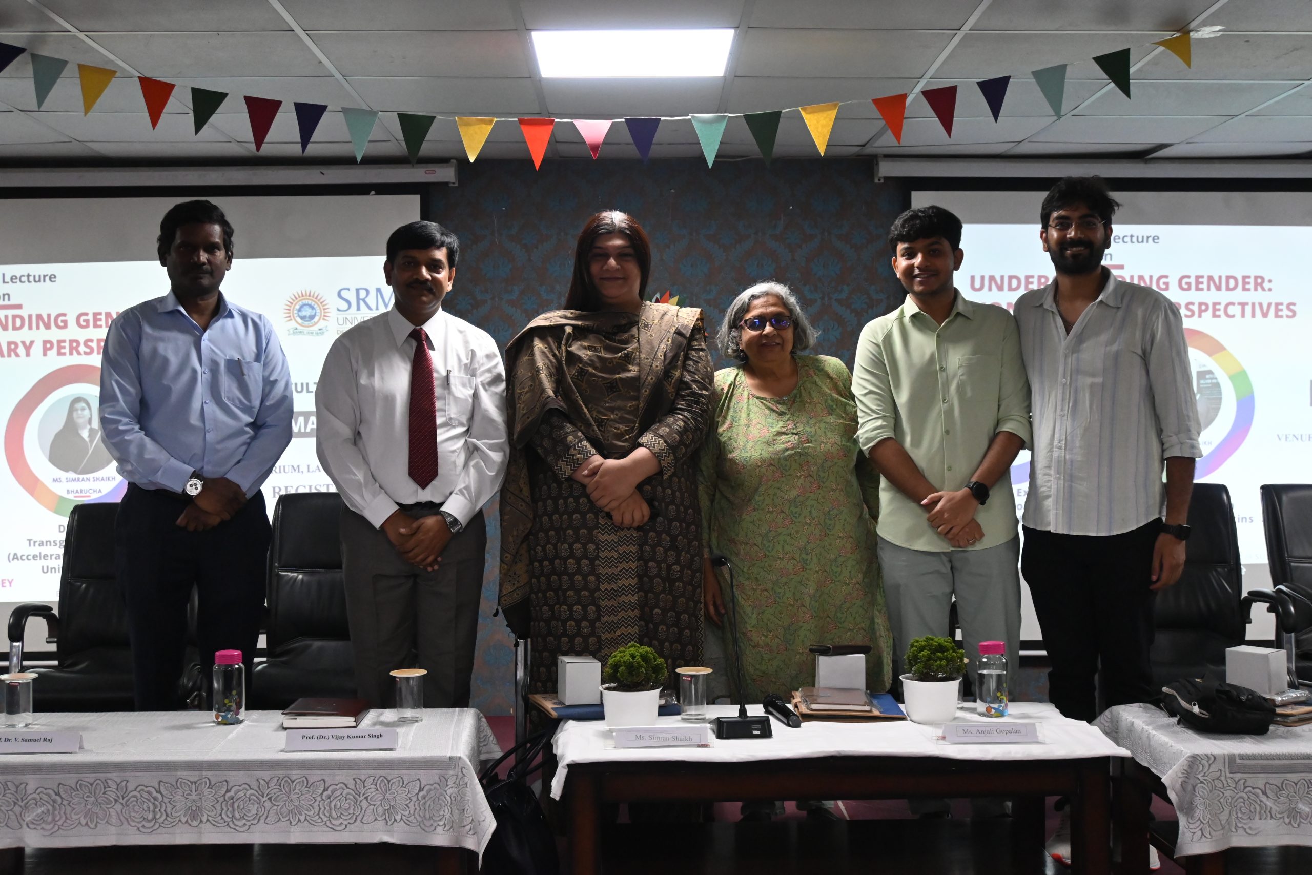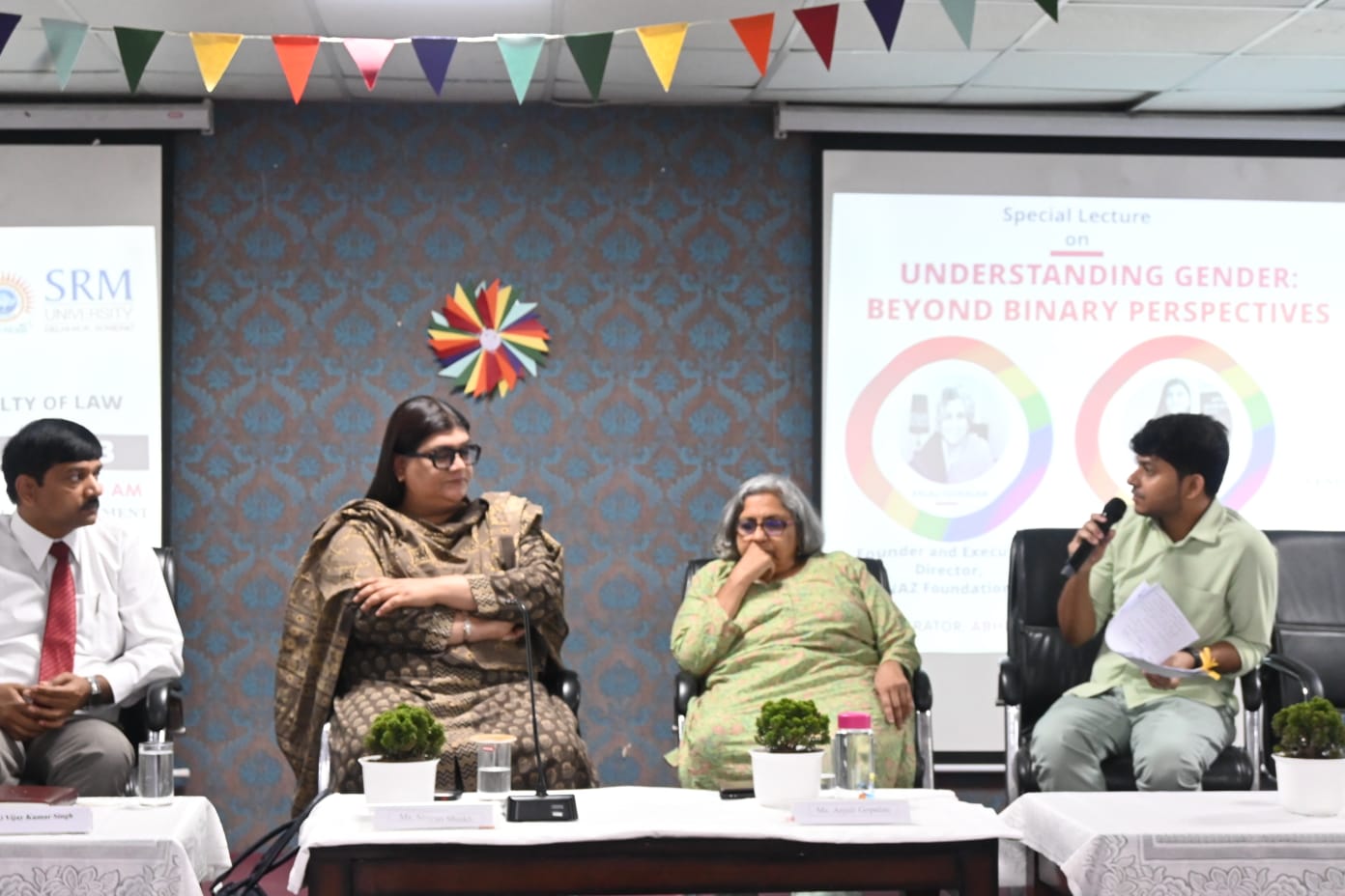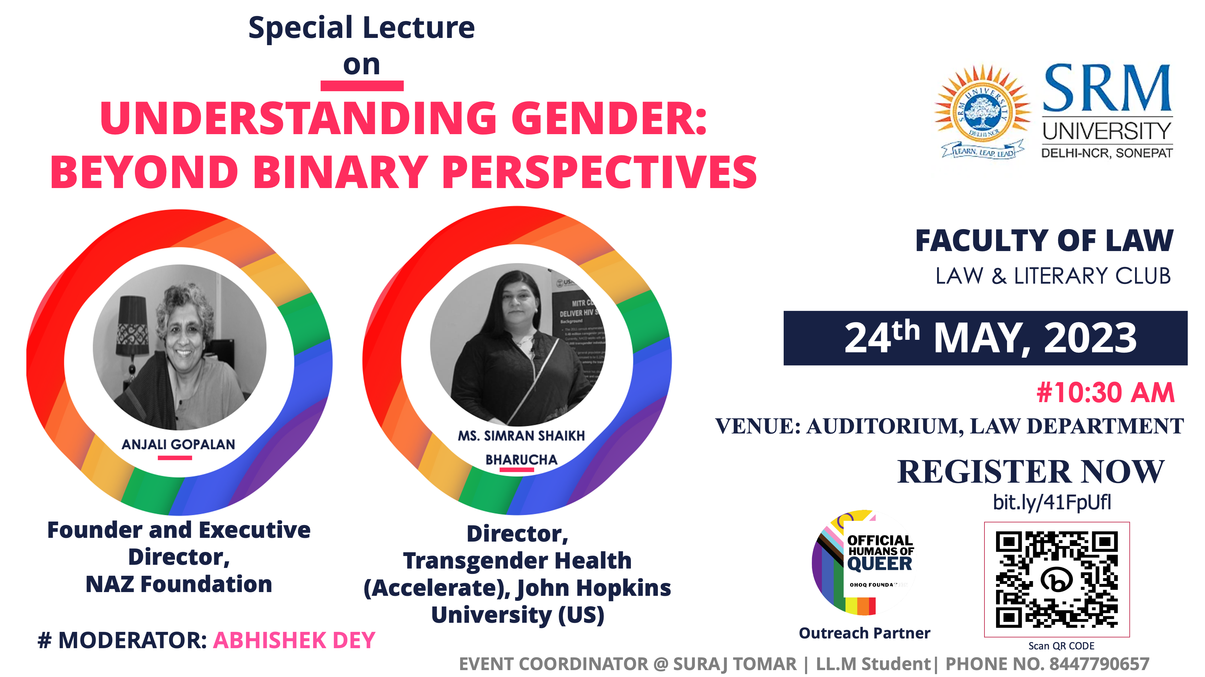 Our founder Adv. Suraj Tomar organised an event on “Understanding Gender: Beyond Binary Perspectives” with the help of Dean of Law (Prof. Vijay Kumar) and the faculty of Law at SRM University Sonipat-Delhi NCR on 24th May 2023. The speakers were Ms. Anjali Gopalan (founder of NAZ (India) Trust and Ms. Simran Shaikh Bharucha ( Director of Transgender Health (Accelerate), John Hopkins University, USA). Our co-founder Mr. Abhishek Dey was invited as a guest moderator/anchor for the same event. The discussion was to normalise the stigma adhered to the LGBTQIA+ community and generate empathy in the hearts of young students. Many questions related to education, law, health, both physical and mental, politics and culture were discussed. The audience comprised of the registrar of the organising University, faculty from various departments and students from various fields- law, Political Science, Biology, Psychology, Engineering, computer application etc.